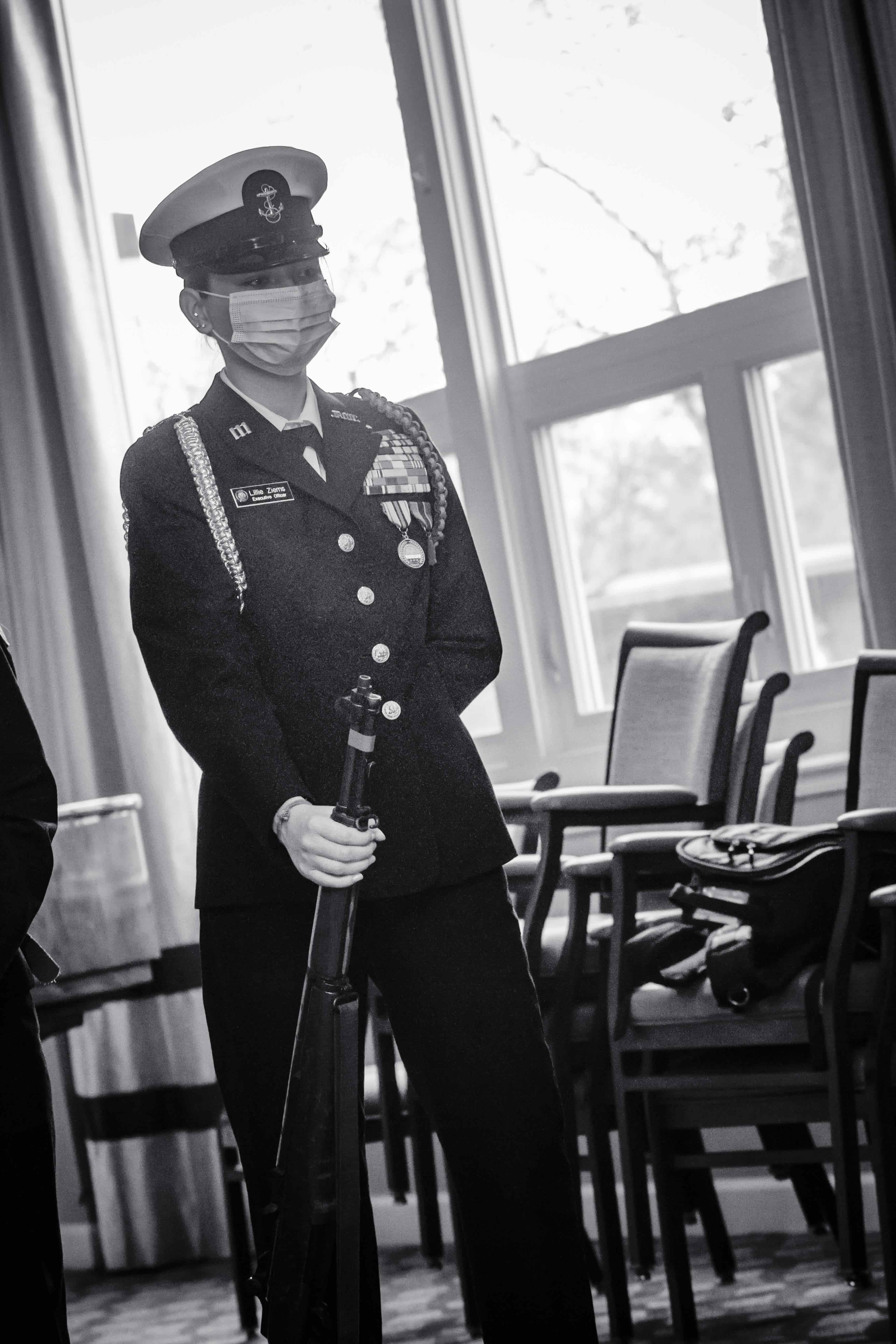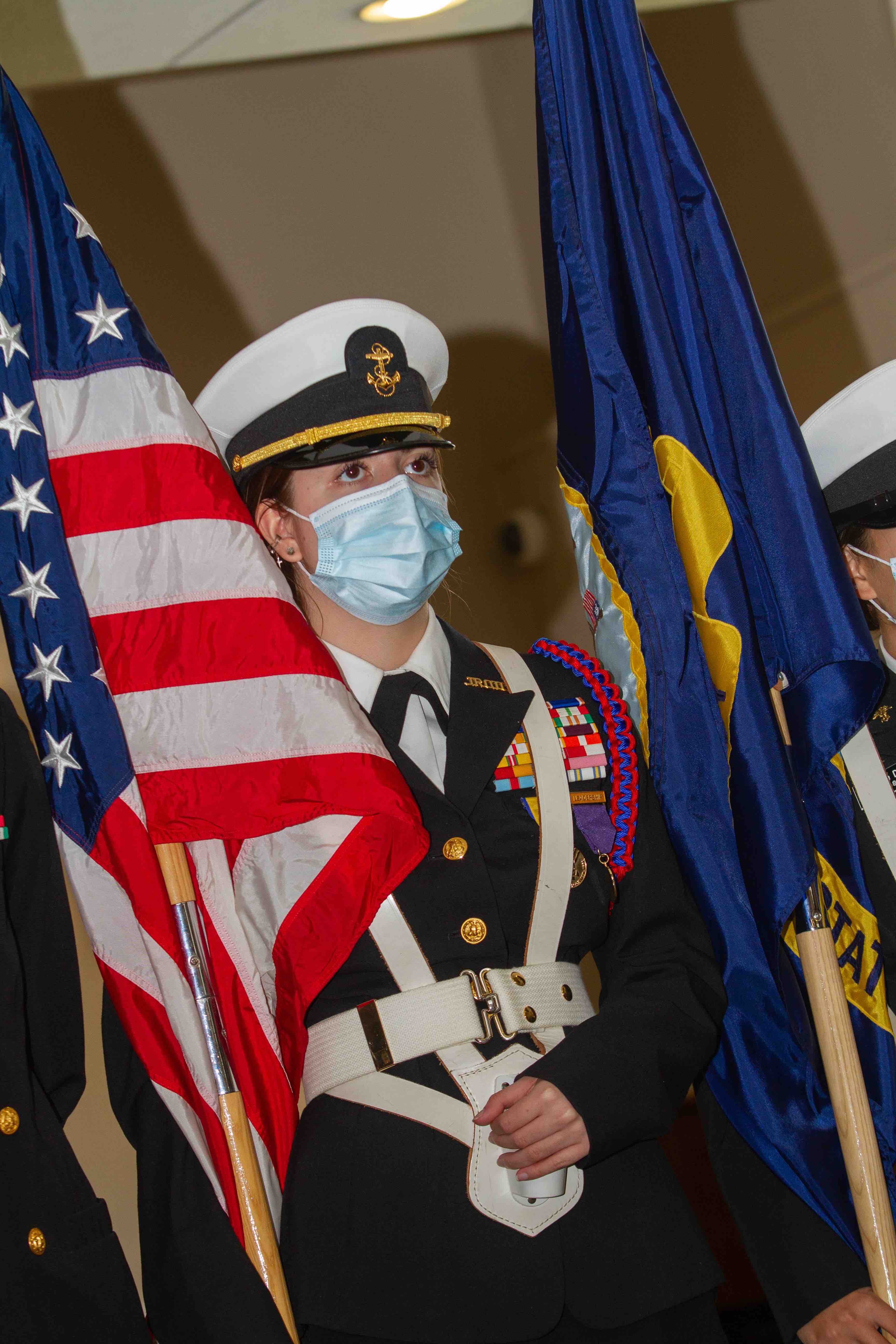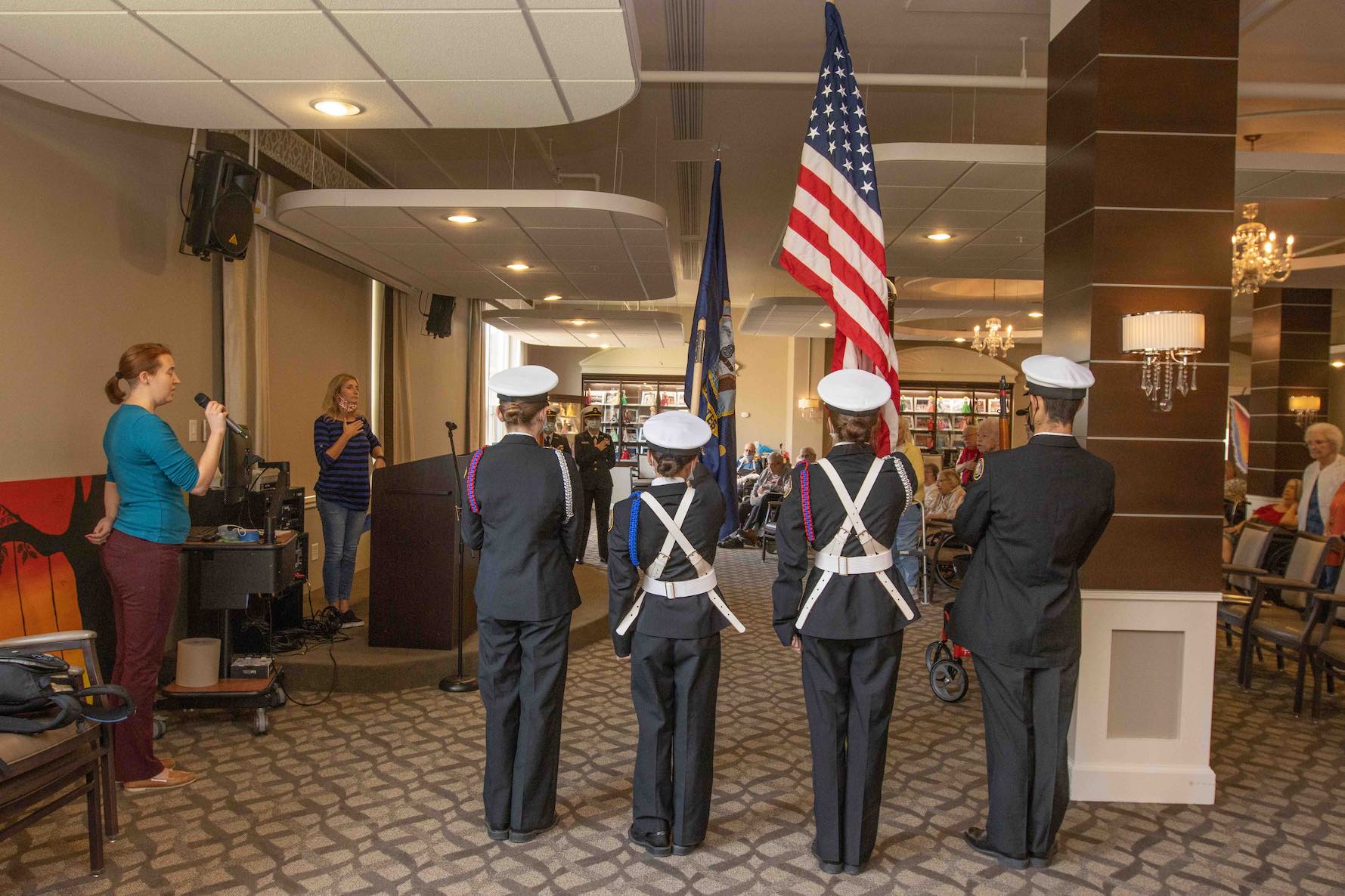 We were pleased to welcome John Sachleben CDR (Ret) USN and the Navy Junior ROTC group from Highland High School to our campus. Presenting in their full uniforms, the midshipmen (a designation that has included both men and women since 1975) helped us wish our military residents a happy Veterans Day in truly fine fashion.
